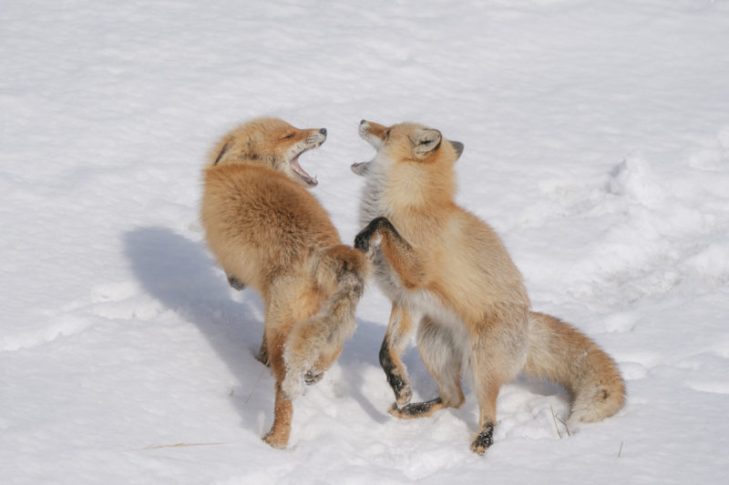 One of them is jumping around with a broken branch in its mouth,